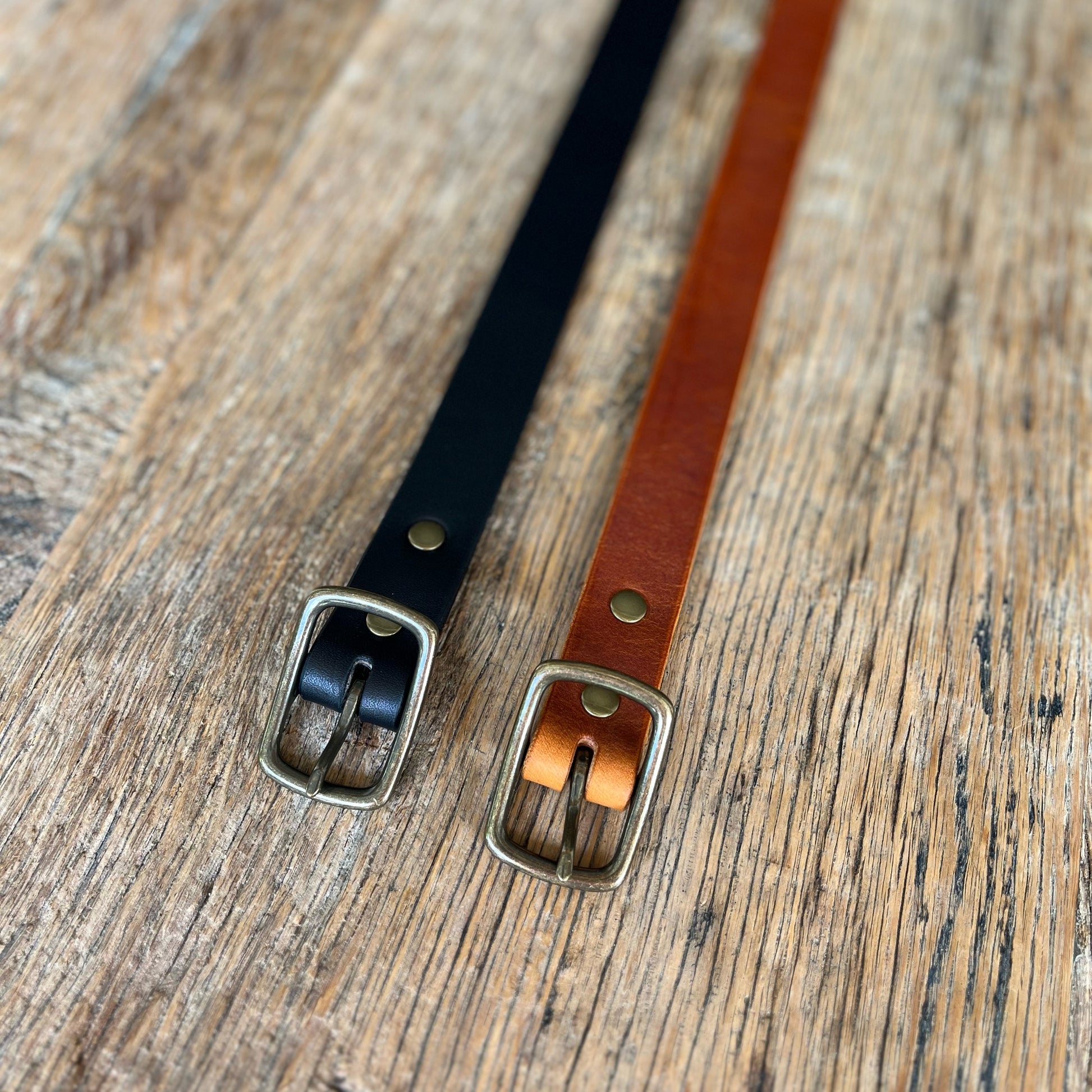 Simple and sturdy - made to last from 3.2-4mm thick premium full grain vegetable-tanned leather. Solid brass buckle and rivets.