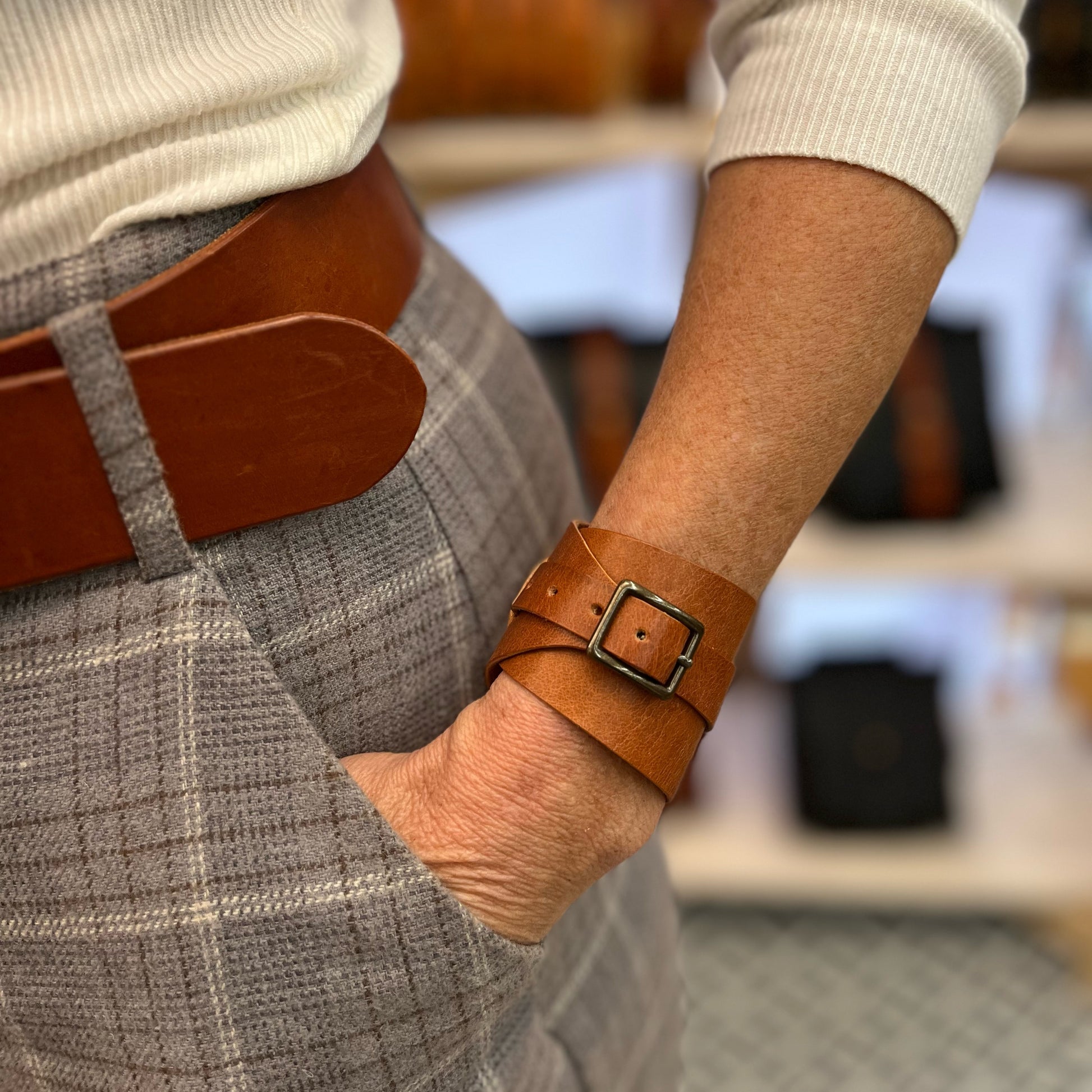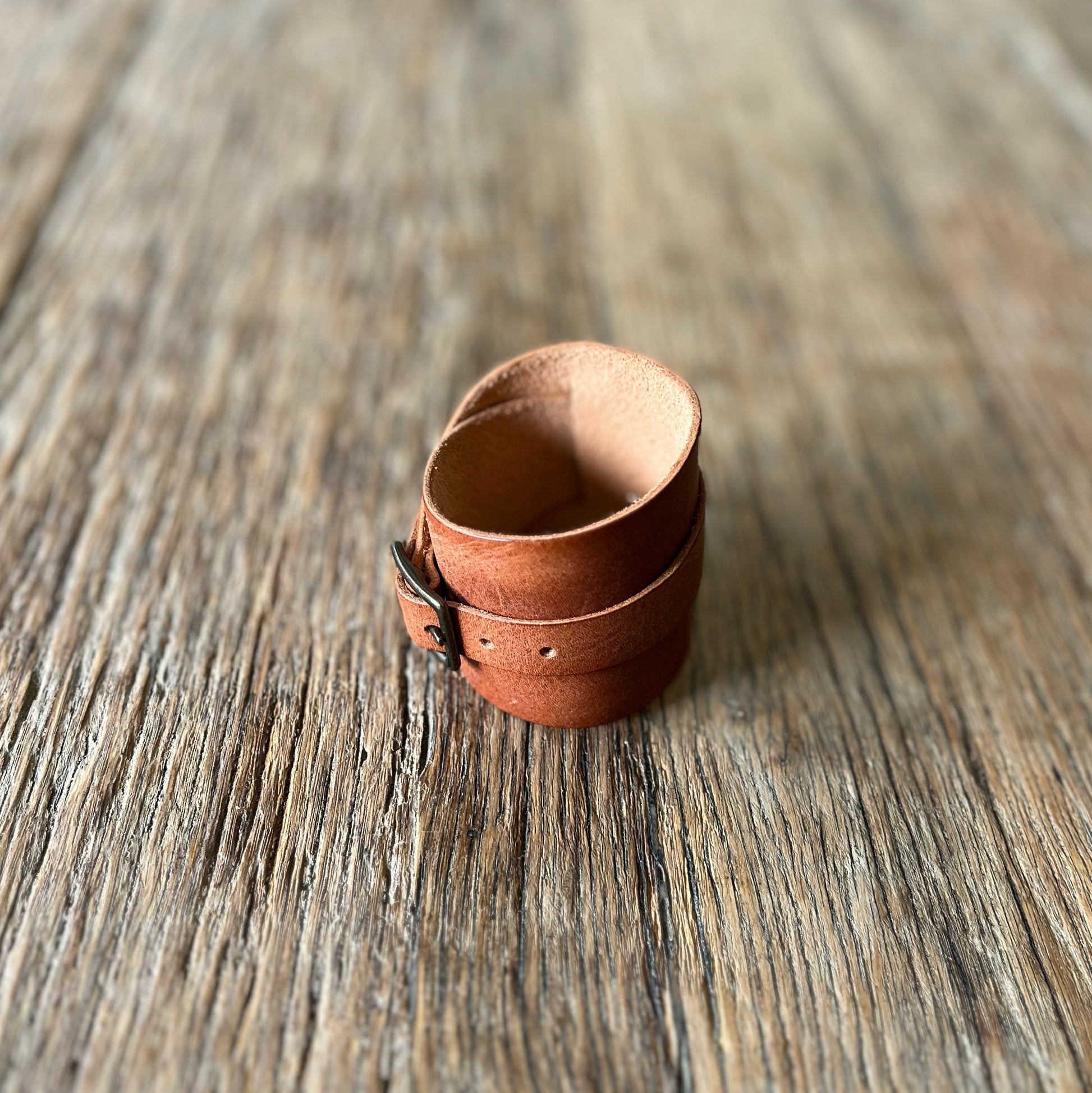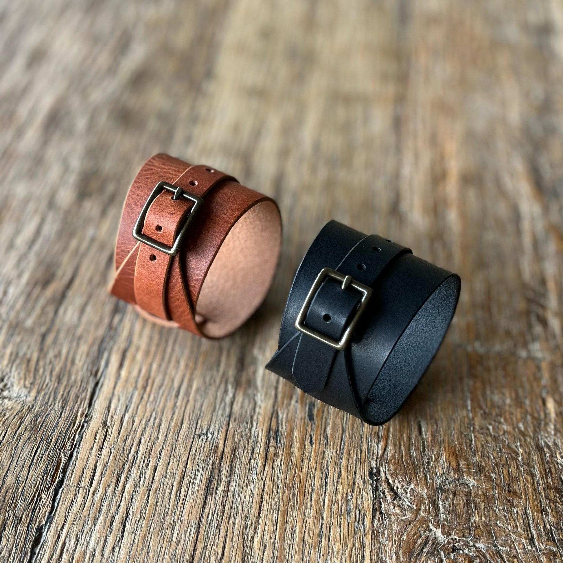 Made from premium full grain veg-tanned leather. This stylish wide lightweight leather wrap cuff is a great addition to any outfit. Featuring a solid brass adjustable buckle closure.