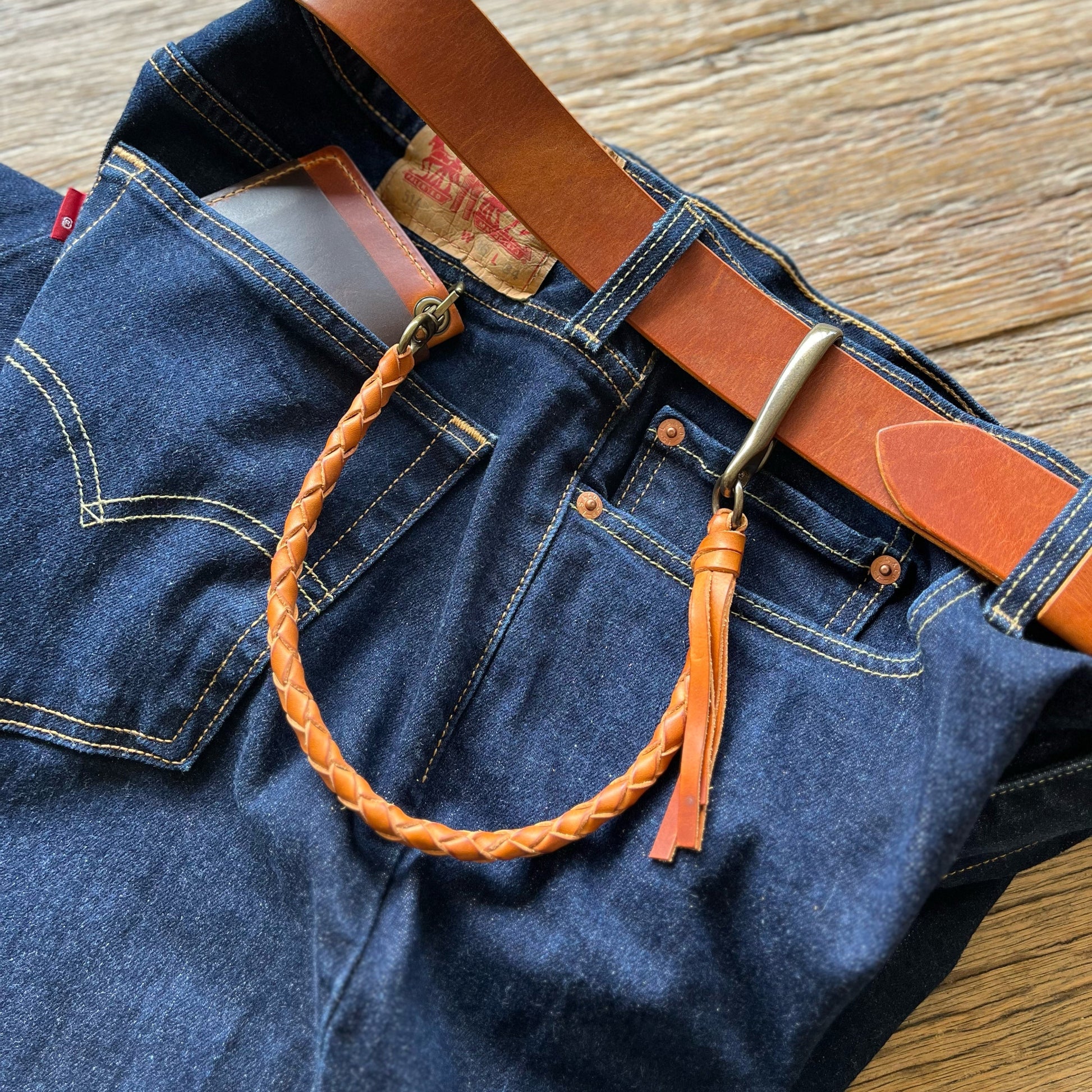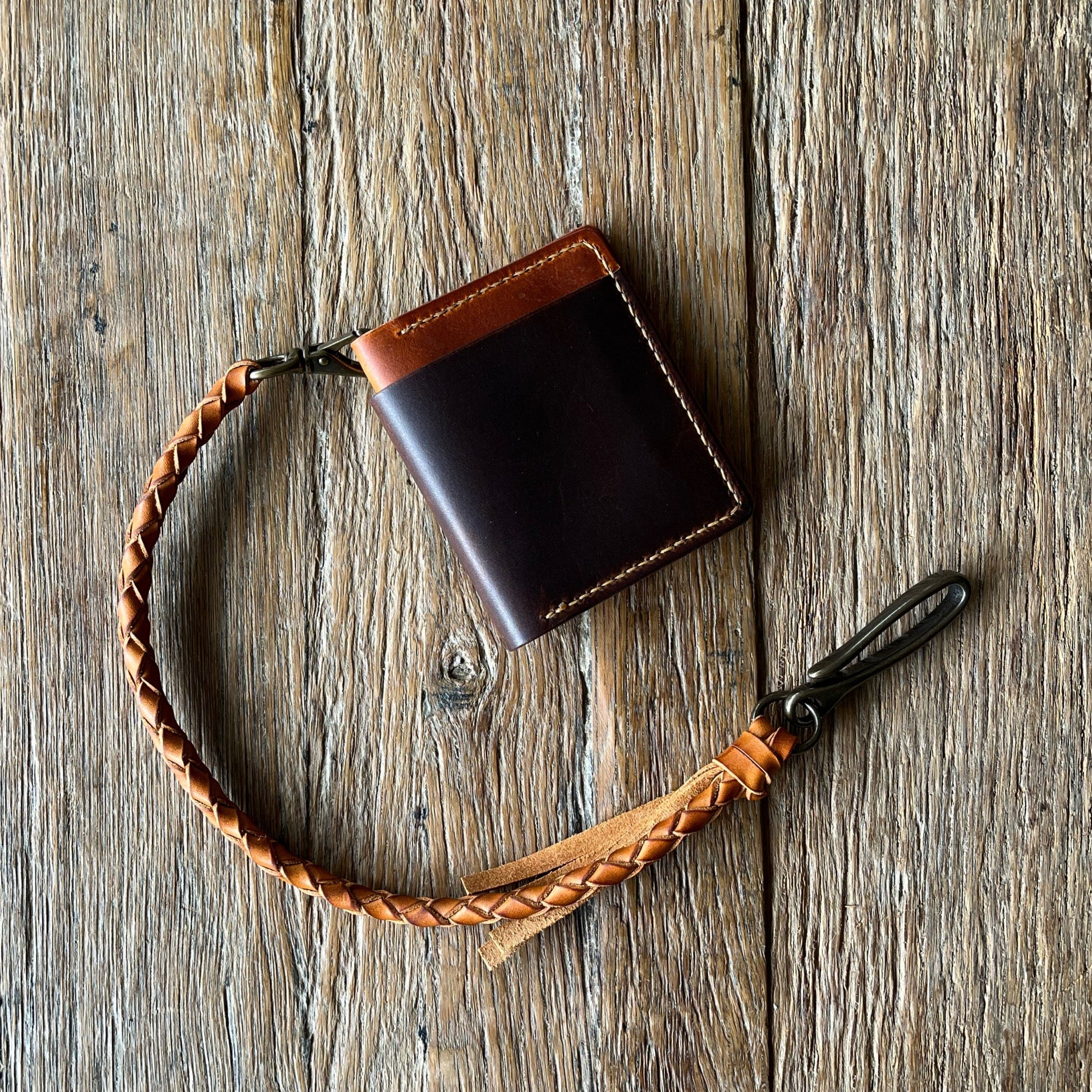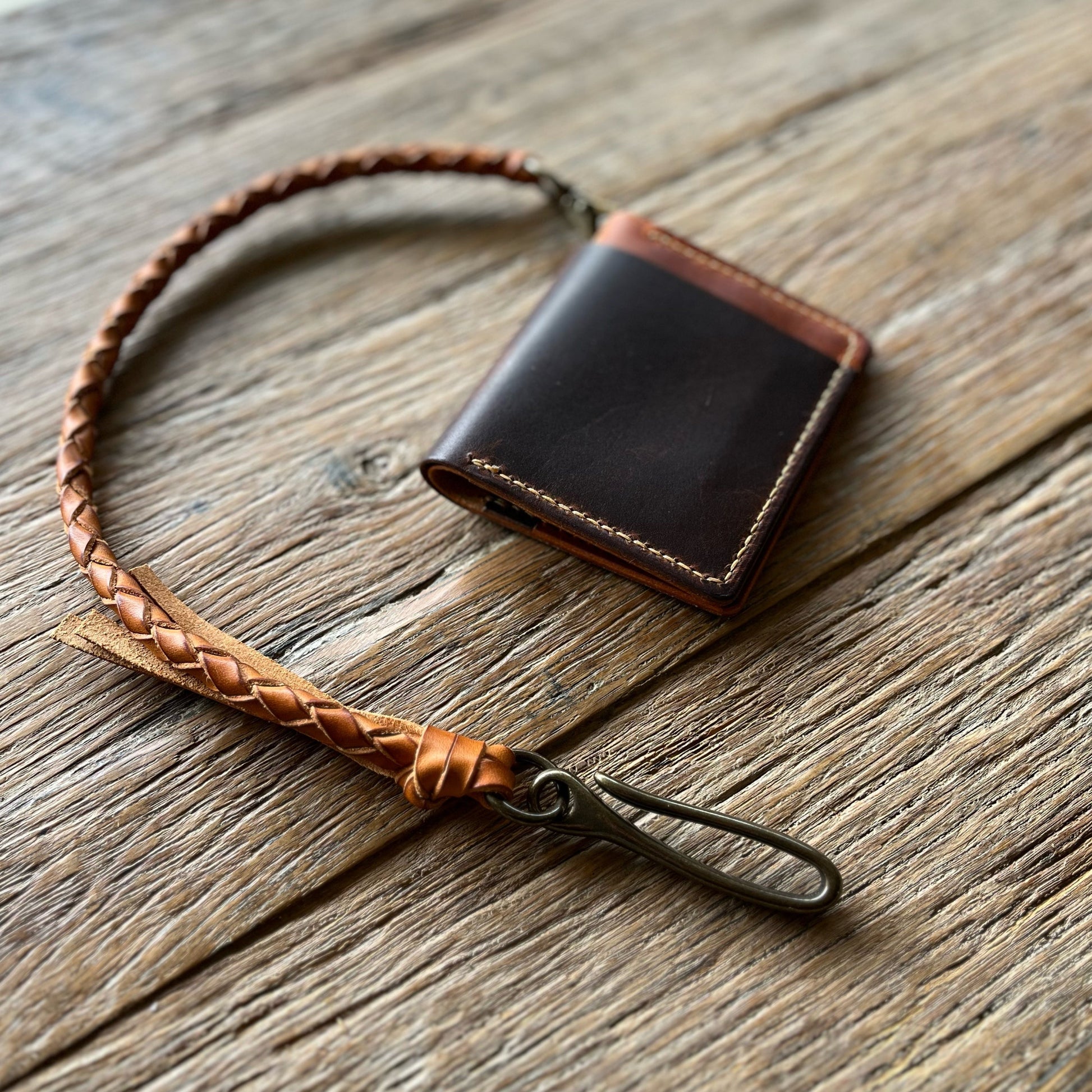 This is our take on the classic bifold cash wallet. Compact yet roomy, it comfortably fits in any pocket. Feel secure with the hand braided leather lanyard with solid brass lever clip and fish hook attached to your belt.